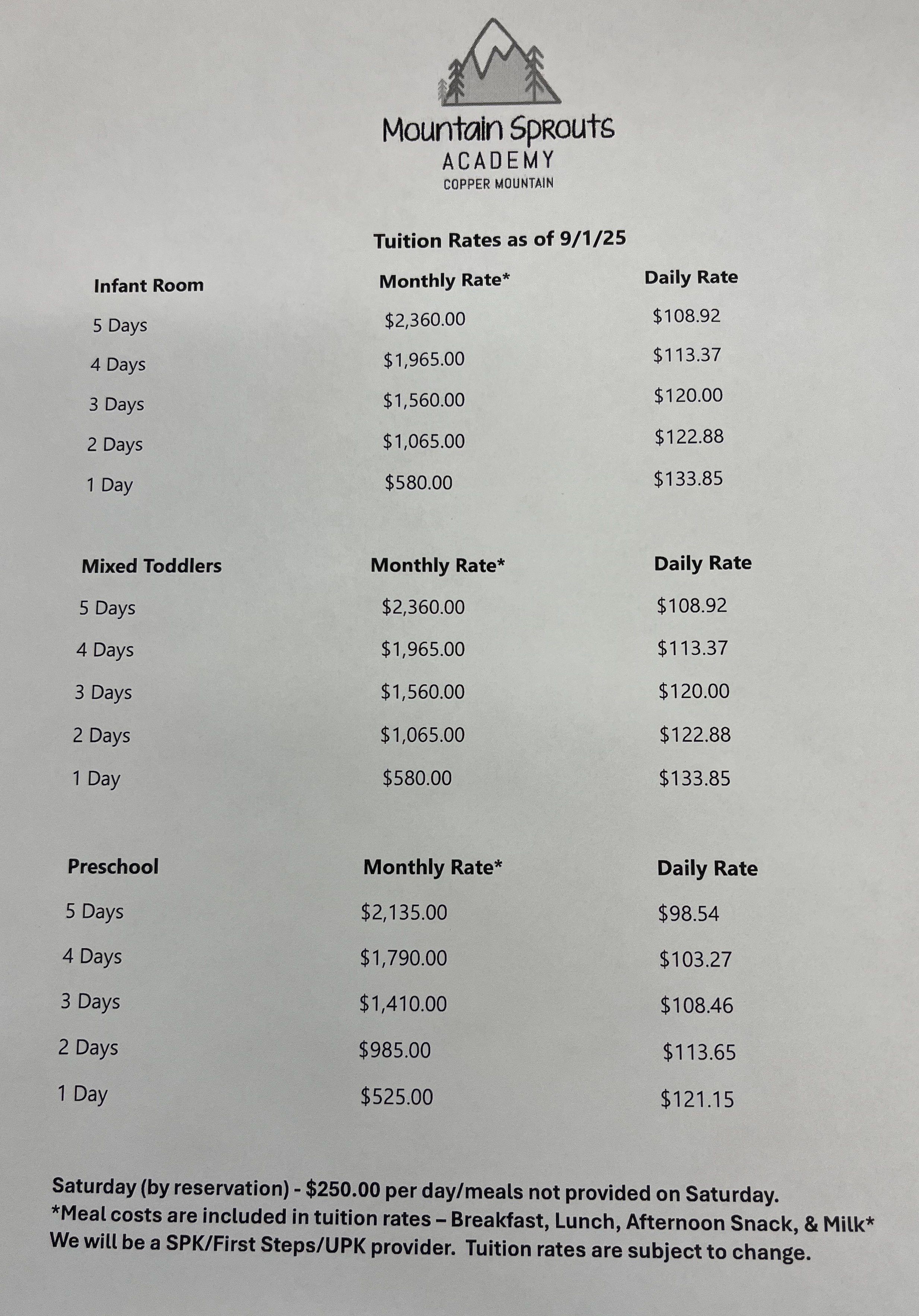 If a Copper Employee resigns or is terminated from their position with a Copper Mountain business, they will be able to keep their child’s spot with MSA academy for 30 days from the time of resignation or termination, unless there is a wait list spot that can fill the position. If a Copper Mountain employee is laid off, they will be able to keep their child’s spot with proof of lay off.
